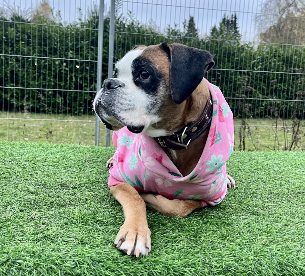 Unsere liebevolle, ältere Boxer-Dame Ajana ist als Sicherstellung mit ihrem Kumpel zu uns gekommen, da die Beiden in Doppelpack nur Blödsinn im Kopf hatten.